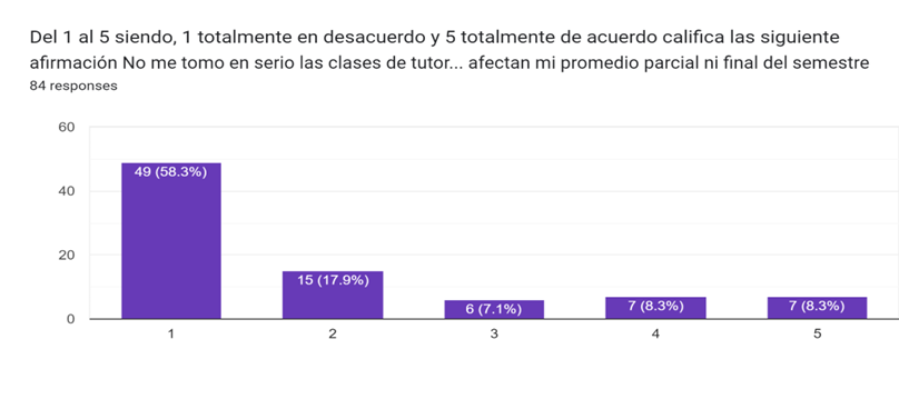 To determine and understand the lack of student participation, we applied a Likert-scale survey, where 1 indicated strong disagreement, and 5 indicated strong agreement with the statement, “I do not take my Tutoring and Integral Wellbeing classes seriously because they do not affect my monthly or semester average.” Fifty-eight percent of the students answered that they completely disagreed with the statement; however, 42% agreed to some degree. See the results in Figure 1.