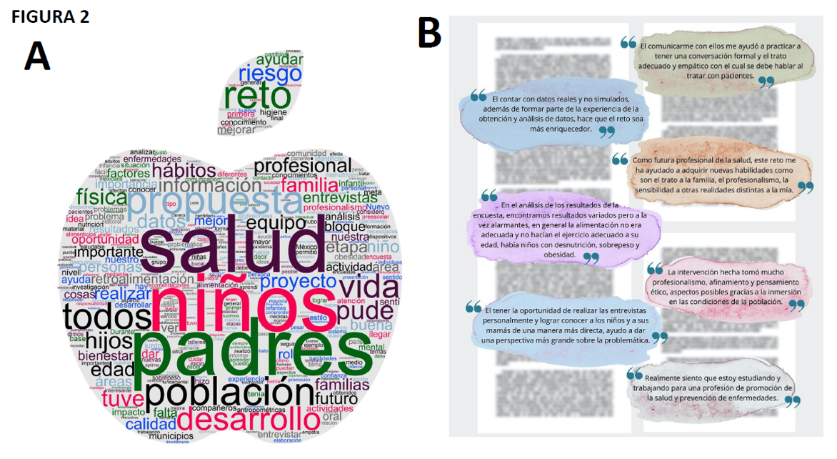 Figure 2. A) Word cloud extracted from 60 reflections of the students in the TU “Life Cycle: Childhood and Adolescence” who participated in this challenge. Figure 2. B) Examples of textual quotations from students’ reflections.