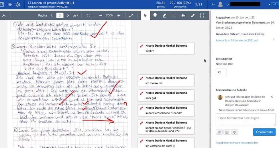 On the Canvas platform, you can give feedback to students on their writings on paper, as shown below: