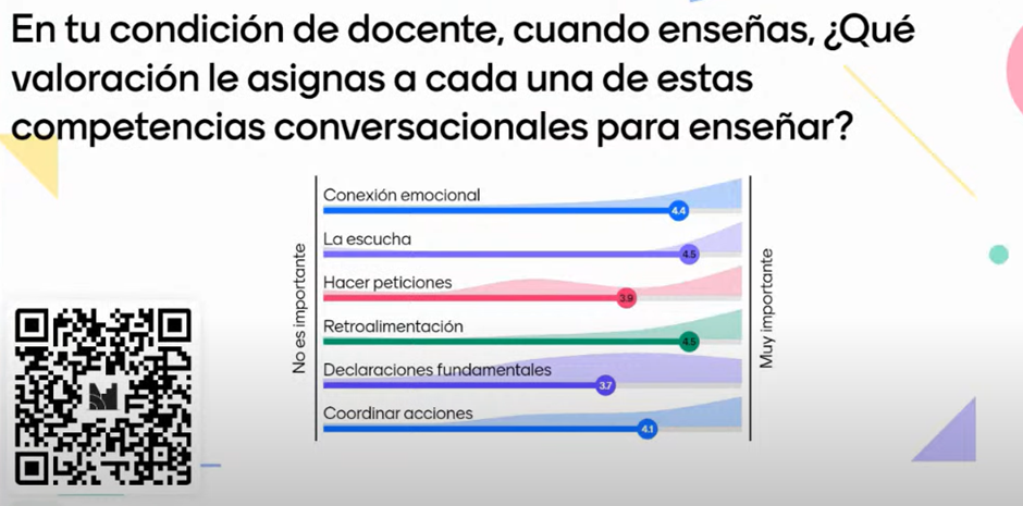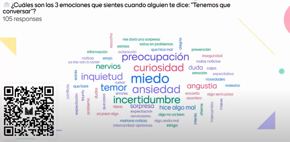 What do we feel when someone says, “We have to talk”? Professor Rivera explains that, although conversation is part of our constitution as social beings, generally, when someone invites us to talk, we imagine something complex. Different emotions, such as uncertainty, fear, curiosity, anxiety, and worry, emerge in the audience’s responses during the webinar (see Image 1). The same happens at work, meetings with friends, meetings to coordinate actions or analyze projects, meetings with family, gatherings at the dinner table, etc.