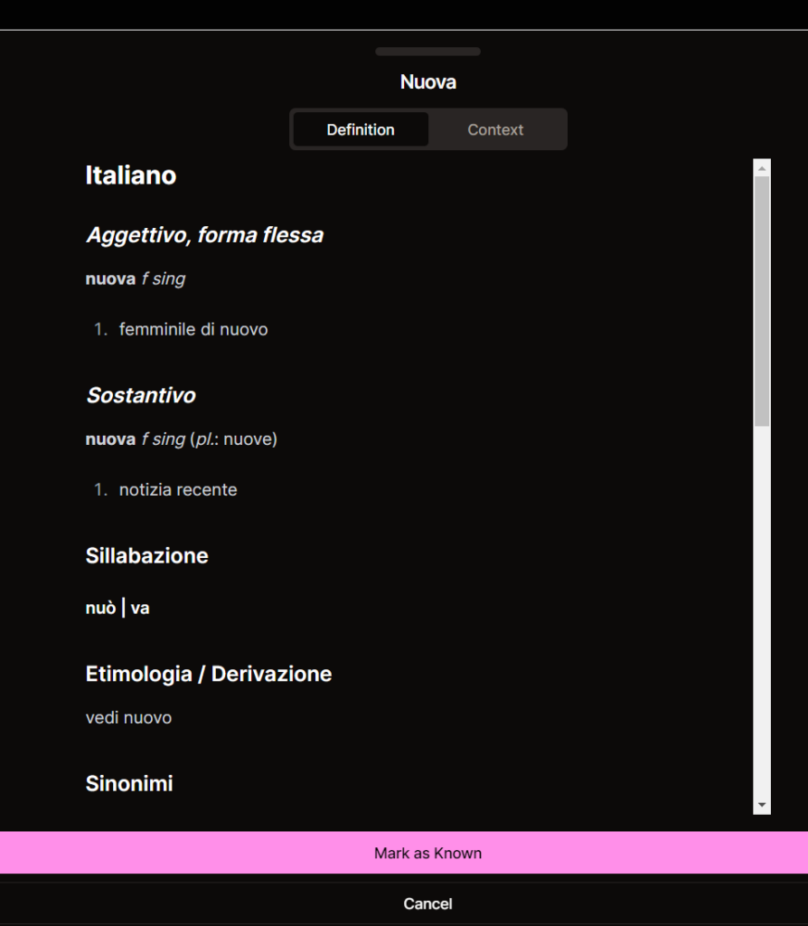 Langturbo is intriguing because you can stop the video to review all or unfamiliar words for definitions and context to improve understanding. After reviewing the word(s), you can mark them as reviewed.