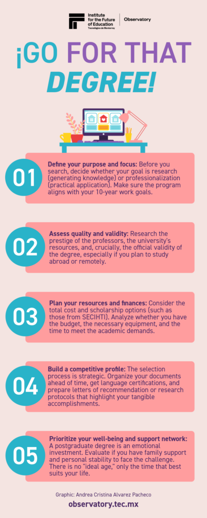 Consider financial and logistical planning as an integral part of the selection process. If you plan to apply for scholarships of excellence, such as those awarded by SECIHTI, make sure that the chosen program is duly accredited and, if necessary, meets the requirements of exclusive dedication. Have the closing dates for funding calls mapped, as they are usually independent of entry dates to the university. Assess whether you have the means to continue with your studies if the support is not granted.