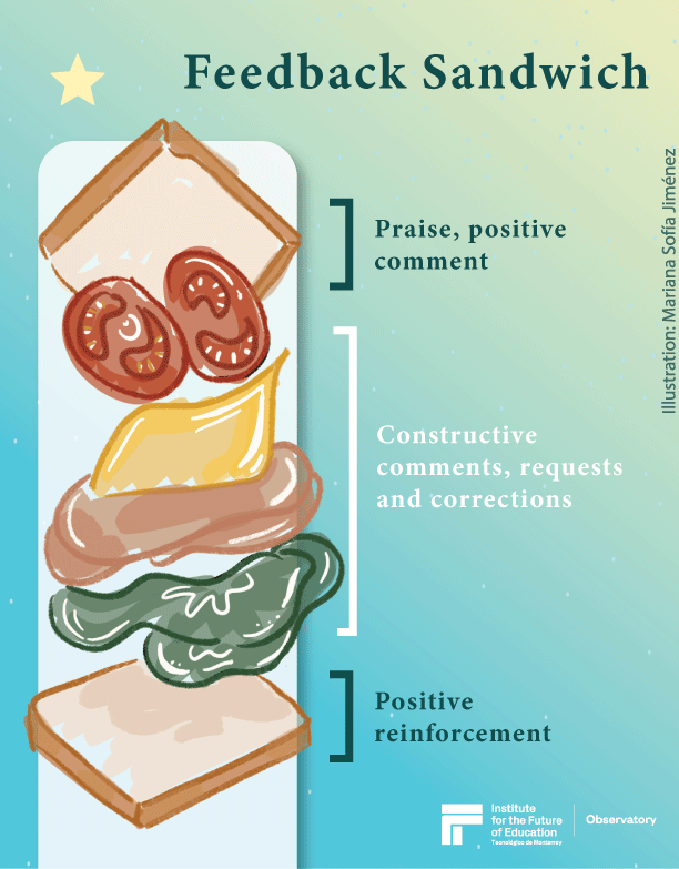 The Feedback Sandwich, coined by Marshall Goldsmith, is a methodology that gained popularity in the workplace in the 1980s due to its simplicity. It consists of praising the person with a positive comment, then proceeding with constructive criticism, areas for improvement, requests, and corrections, and concluding with positive comments and reinforcement. Thus, the positive feedback items are the slices of bread that “wrap” the ingredients, which are the areas of opportunity.