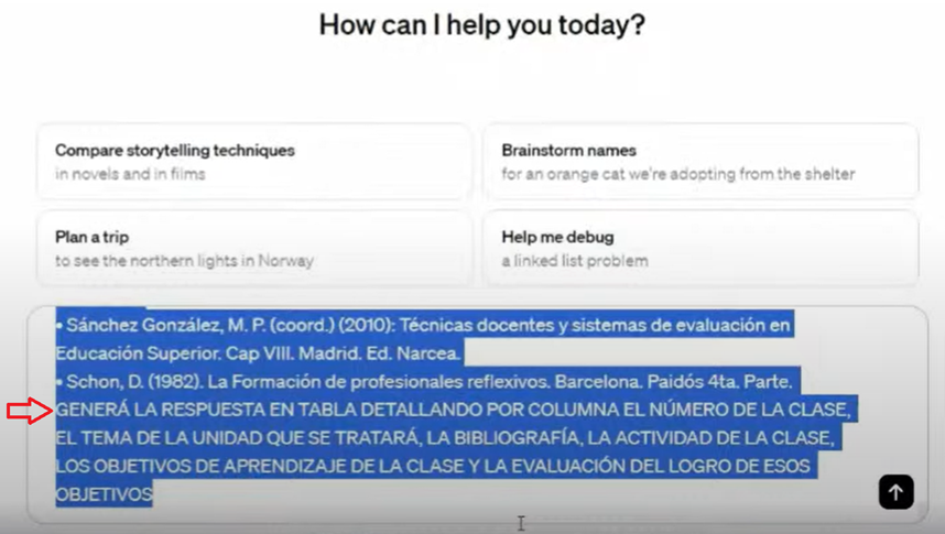 2. Before any query, we must position or indicate to ChatGPT that it is a teacher and expert in teaching so from that perspective, it can provide the information we need, using the following instruction: “You are a teacher of the (corresponding) subject at the (corresponding) educational level of basic, middle, high school, or higher education. As an expert in didactic planning at this level, prepare your didactic plan for four classes, developing this unit. Subsequently, in the same prompt field, you, as a teacher, copy and paste the program of the subject you want ChatGPT to consider in the planning. See Image 1. See the complete video.