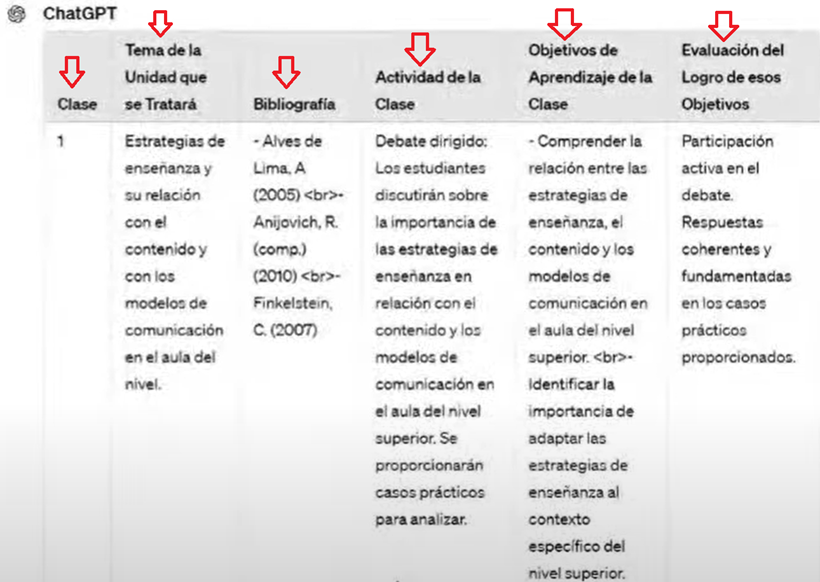 3. Once you have added the program, in the same instructions, you need to tell ChatGPT how you want it to return the requested information. For example, in the video, Professor Verónica Caputi told ChatGPT to “Generate an answer in table format detailing by column 1) the class number, 2) the topic of the unit to be discussed, 3) the bibliography, 4) the class activity, 5) the learning objectives of the class, and 6) the evaluation of achieving those objectives”. See Image 2. See the complete video.