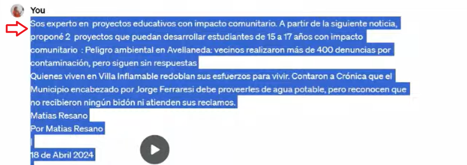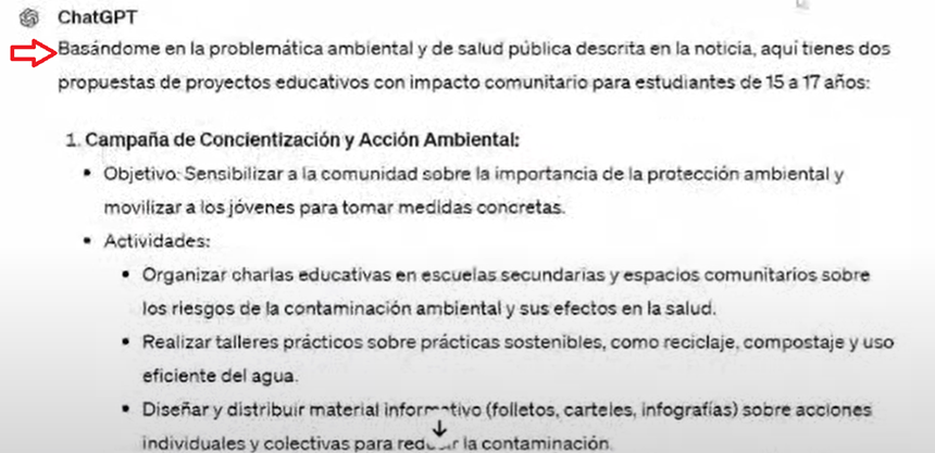 We often want to do different things in class, but we don’t know how. For example, ChatGPT can be a valuable ally in integrating the UN 2030 Agenda for Sustainable Development into curricular designs. We can ask ChatGPT, “How can we bring the UN 2030 Agenda to the classroom and subsequently impact the community through an educational project involving students between 15 and 17 years old? (See Image 7.) In this example, teachers must know what they are asking, be familiar with the Sustainable Development Goals (SDGs), and understand the 2030 Agenda for Sustainable Development. Why is the project relevant to the world, and what does it mean to have an educational impact? All this information must be well-understood by the teacher before prompting the chatbot. In the webinar, Professor Caputi asked ChatGPT this question; see ChatGPT’s response in Image 8. See the complete video.