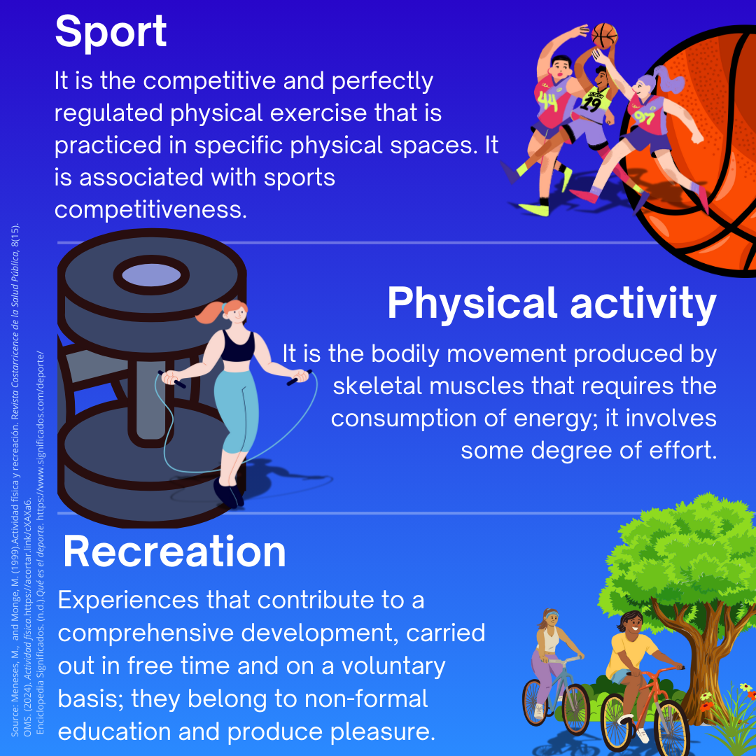 Before proceeding, we must consider that physical activity, sports, and recreation imply different things and cannot be used synonymously. See the following graphic.