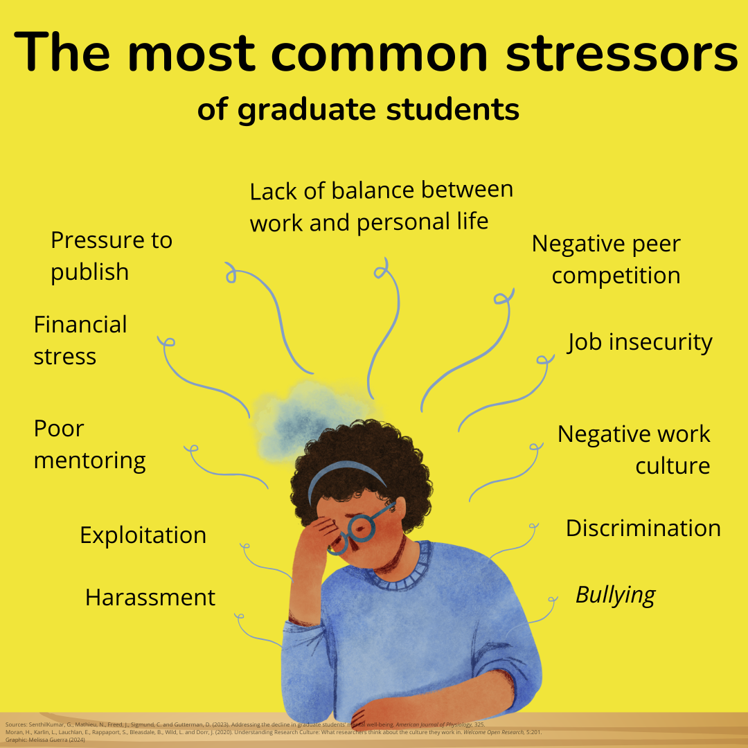 A 2022 Nature survey indicated that 85% of graduate students worried about not having enough income for living expenses, and 45% said they might need to abandon their studies because they could not afford them and personal expenses. This adds more pressure, stress, and anxiety, so the prevalence of mental health issues is remarked.