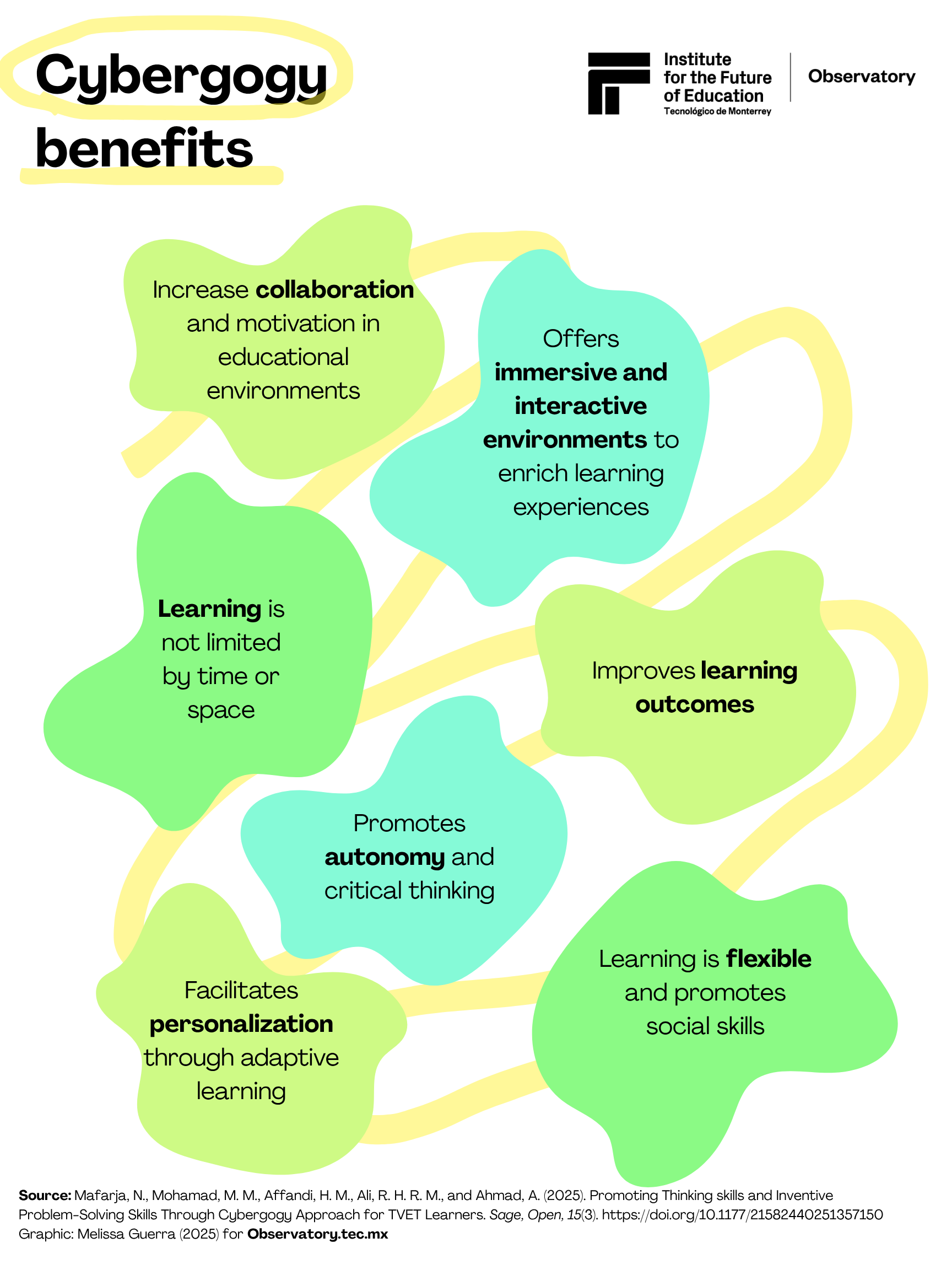 Currently, authors such as Mafarja et al. (2025) define cybergogy as a teaching-learning methodology that leverages the benefits and opportunities of digital technologies, including virtual reality (VR), simulations, and gamification, among others, to create immersive learning experiences that increase motivation and promote higher cognitive skills. This paradigm focuses on the teaching and learning processes in digital spaces and virtual classrooms, enhancing student participation, collaboration, and autonomy.