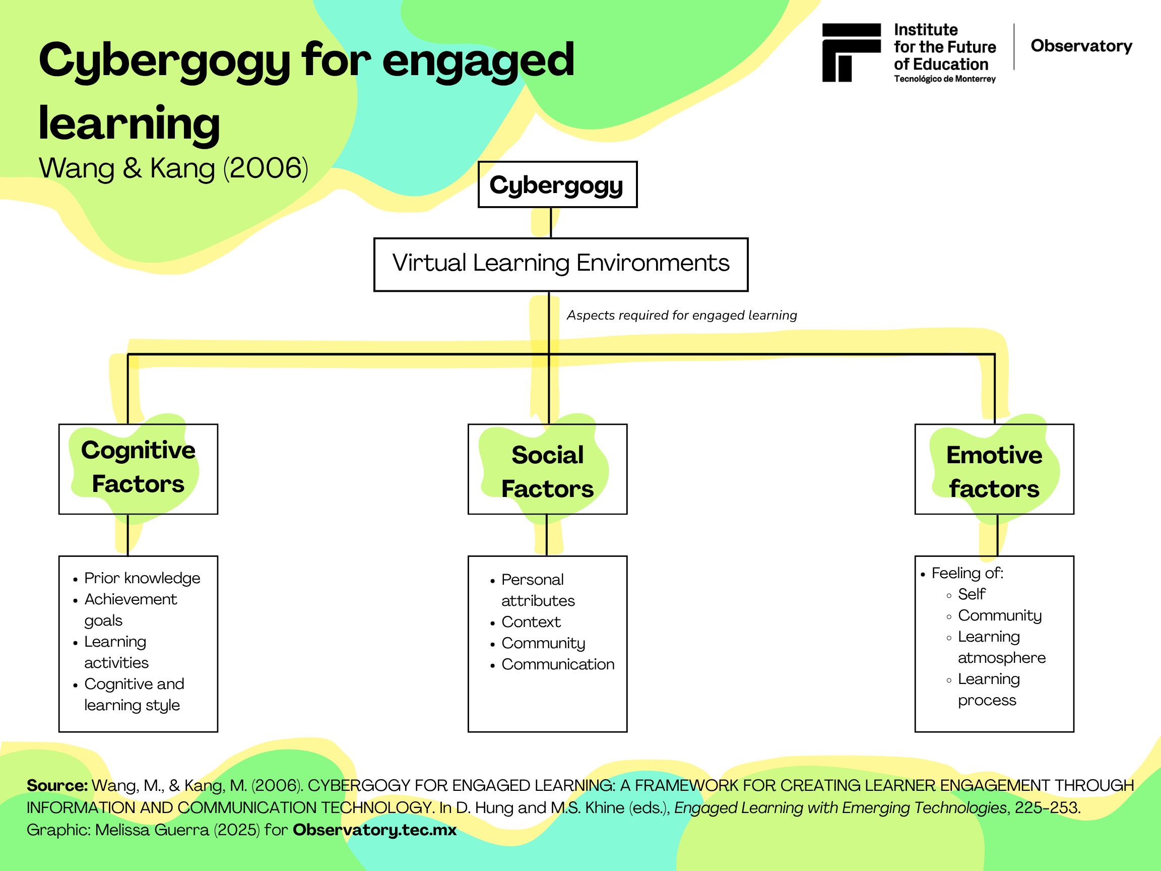 Wang and Kang (2006) proposed a cyber pedagogy model for participatory learning, which considers the three key factors of virtual learning environments: social, cognitive, and emotional. The social factor refers to interaction and collaboration that promote learning; the cognitive factor is related to learning processes and the construction of knowledge; and the emotional factor draws attention to emotions during the teaching-learning process.